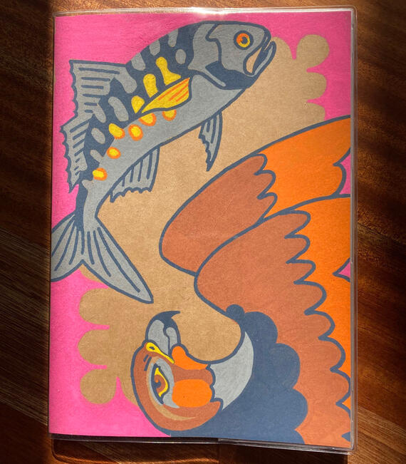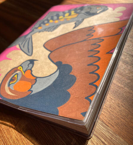Wrap-around painted cover, protected by a PVC cover. These small Muji diaries are my favourite thing to carry around.